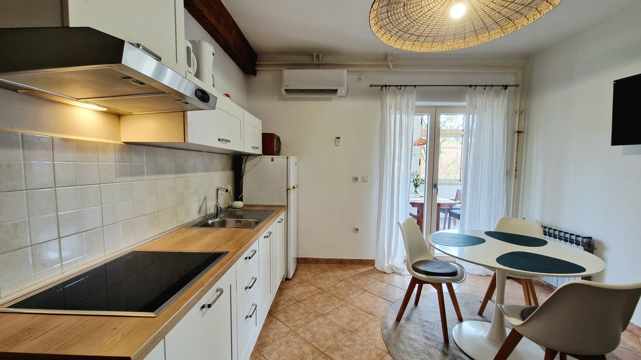 We have a very nice large Fridge with a separate Freezer. The Kitchen contains everything you desire to prepare your favorite dishes. This contains a Coffee machine, a Toaster for Bread, cutting boards, a great selection of knifes and plates and cups. In Poreč, tap water is drinkable and of high quality, so you can drink it freely without having to buy bottles.
